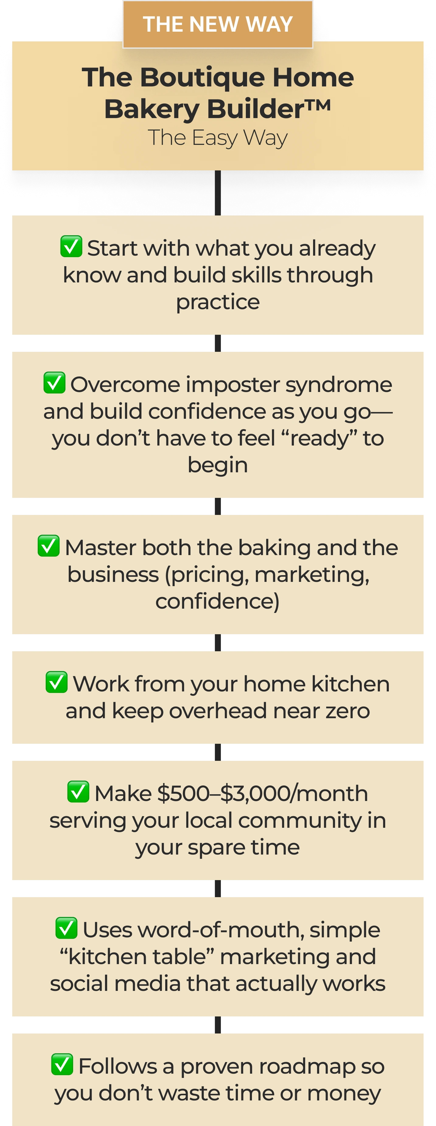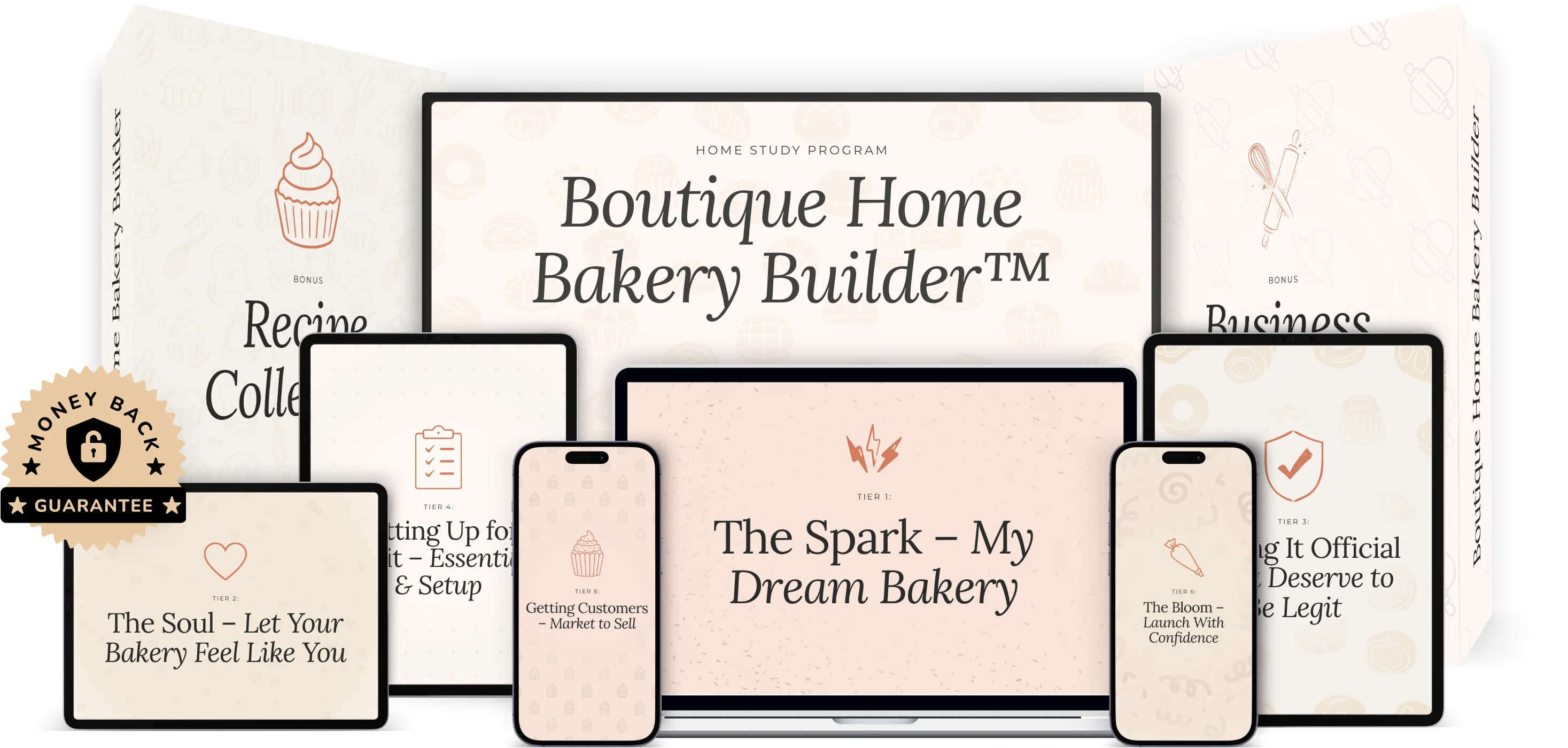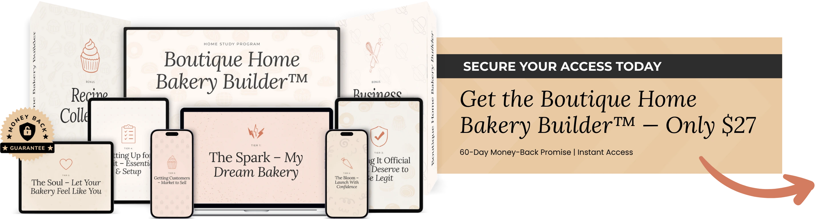 I’ve taken every mistake, every breakthrough, every system I wish someone had handed me—and turned it into a gentle, step-by-step roadmap called the Boutique Home Bakery Builder™.